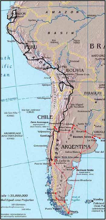 Sind in der Wahlheimat von Margot und Erich (moege er in der Hoelle schmoren) angekommen. In Santiago kuemmerten wir uns um unsere geschundenen Boecke. Wir holten Mopsens neuen Thermostat aus Deutschland vom Flughafen ab. Lufthansa, ADAC und Wickel sind ein unschlagbares Team (Danke Wickel). Wir konnten es nicht fassen, dass es die Chilenen nicht vermasselt hatten. Danach gingen wir dem Geheimnis des seit 5000 km klappernden Hinterrades von Klattes Bock auf die Spur. Als der Mechaniker das Rad zerlegte, flogen uns saemtliche Innereien um die Ohren. Der Anblick erinnerte stark an Kottes Savage-Motor. Da es in diesem Entwicklungsland keine Ersatzteile gibt, musste der Scherge ein neues HInterrad aus einem runden Wuerfel feilen. Nun rollen die Raeder wieder fuer den Sieg. Heil aus dieser Sache herausgekommen nahmen wir die naechsten 700 km im Sturm.